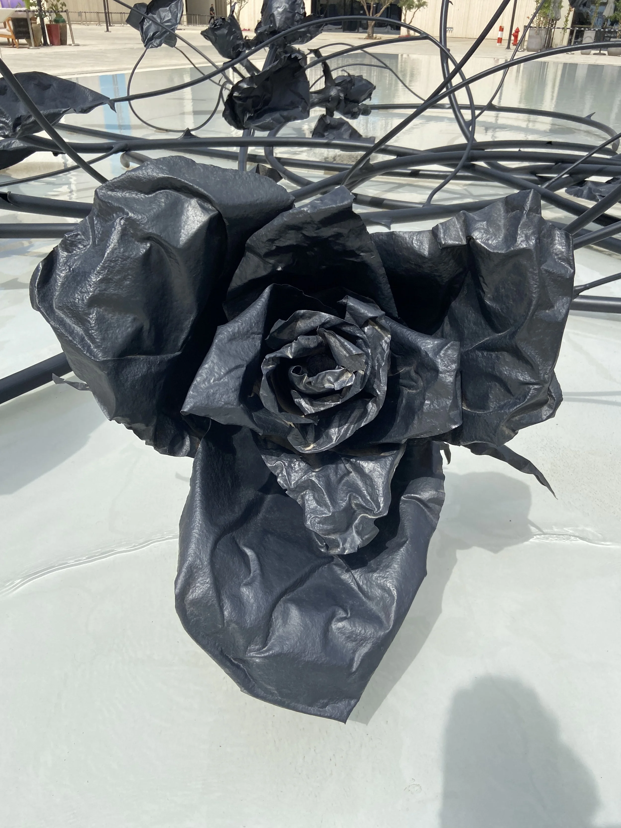 The garden of colossal metal roses simultaneously evokes the common opening gesture in classical Arabic poetry of Al Atlal, which translates to the ruins or remnants. It usually consists of describing a scene of desolation and decay, evoking feelings of nostalgia, loss, and the passage of time, honoring the memories associated with those ruins.